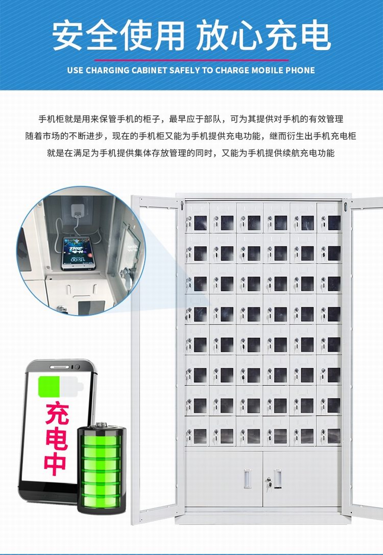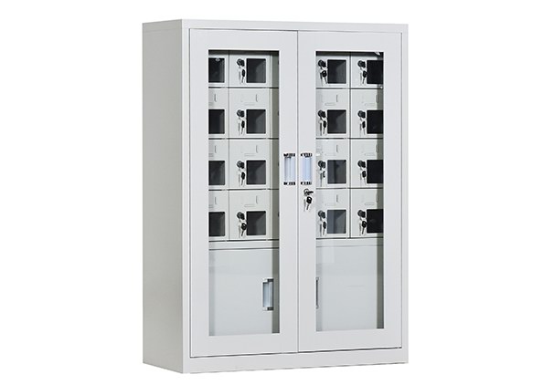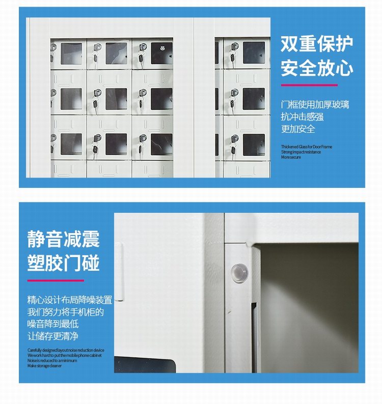 手机保密柜正面为对开金属边框玻璃大门,便于观察柜内情况,坚固透亮,美观大方。